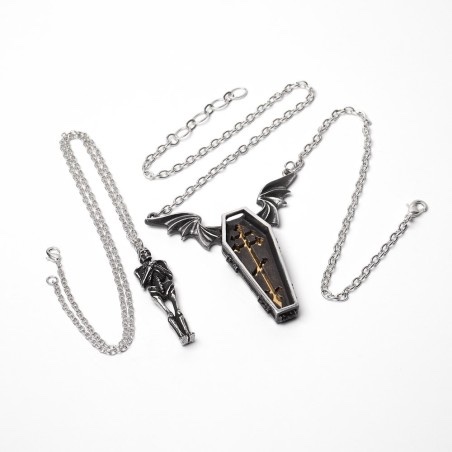 Embrace the profound connection you share with your partner through the exquisite ‘Undying Homage’ two-piece coffin and Skeleton couples necklace. This isn’t just jewellry; it’s a celebration of your love that intertwines life, death and intimacy in a truly unique design. The skeleton nestles peacefully inside the coffin and can be worn together. Or each piece can be worn independantly. “Undying Homage.” This unique message serves as a testament to your eternal connection, no matter how you wear it! .