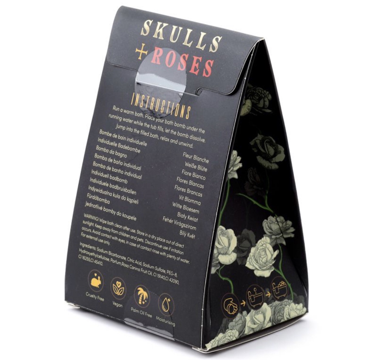 Product Description Skulls and Roses Bath Bomb in Gift Box Material: Bath Salts and Essential Oils Fragrances: White Blossom, Rose, Royal Amber Ingredients: Full ingredients can be found on the product packaging. Weight: Each bath bomb is approx. 160g Vegan: Yes Palm Oil Free: Yes Gluten Free: Yes Cruelty Free: Yes Product Attributes Dimensions :- Height 6.5cm Width 6.5cm Depth 6.5cm
