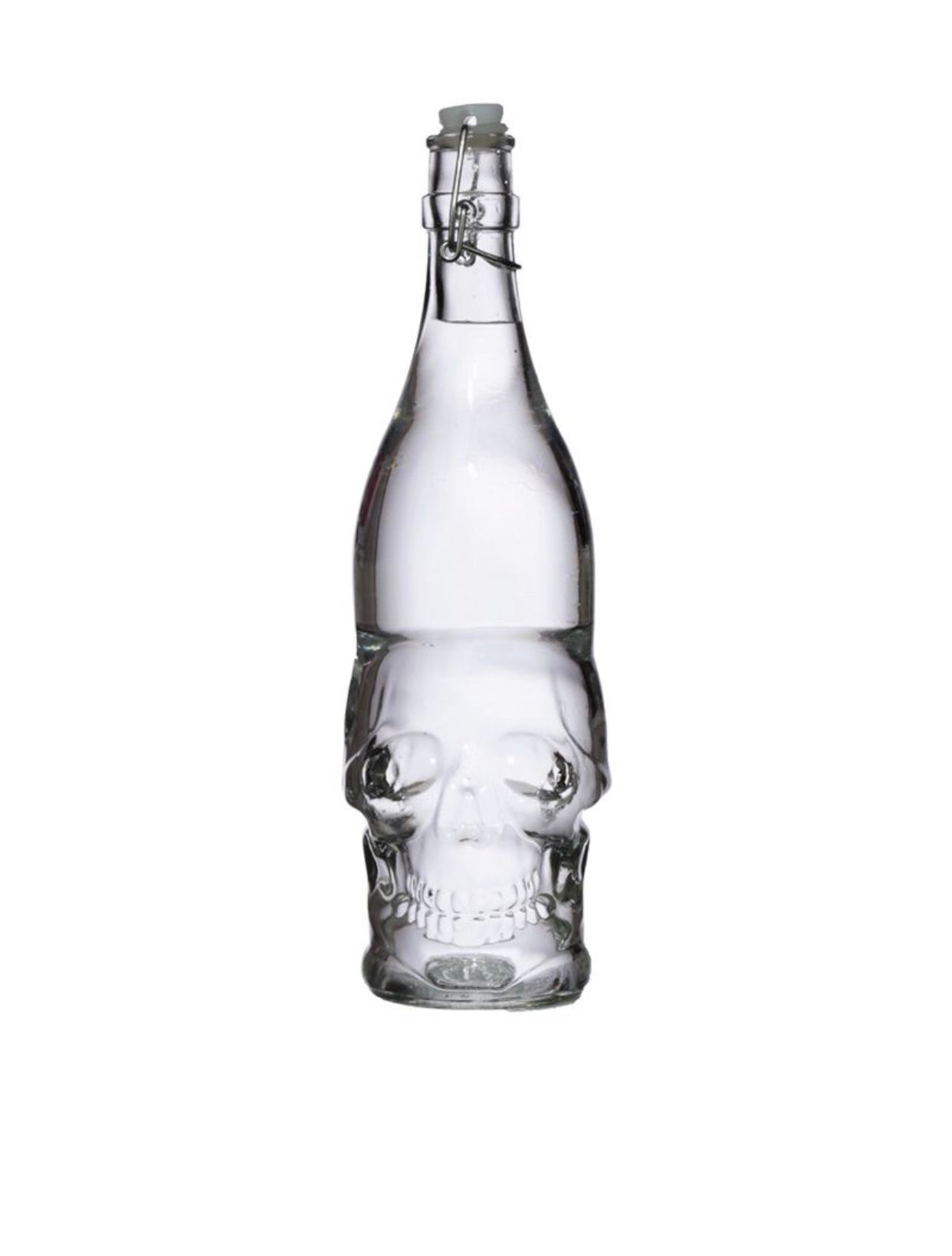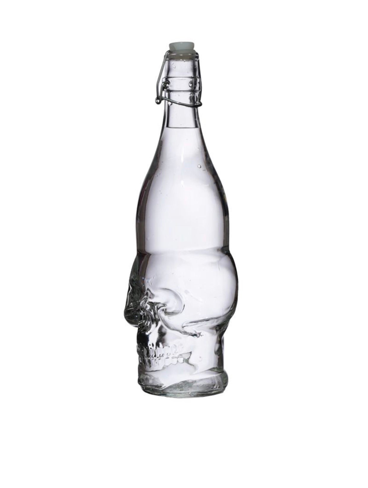 Skulls & Roses Clear Glass Skull Shaped Water Bottle (1L) (Clear Glass) (31.5cm) Material: Glass, Metal and Plastic Volume: 1 Litre Food Safe: Yes Dishwasher Safe: No Product Information: Not suitable for hot liquids. Dimensions:- Height 31.5cm Width 9cm Depth 10.5cm