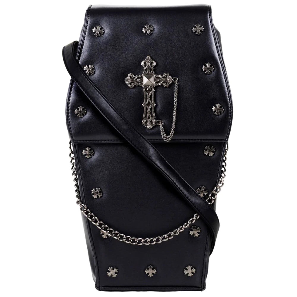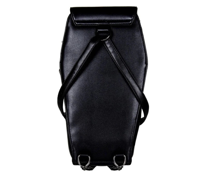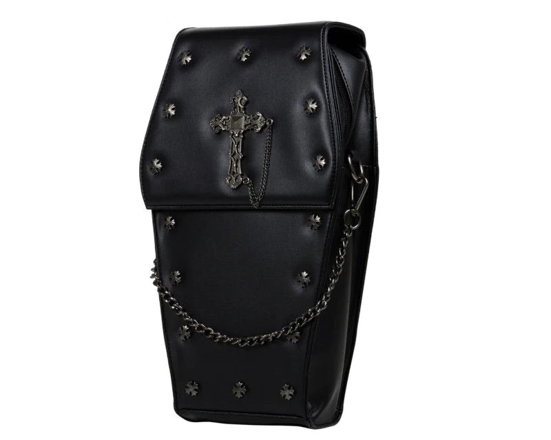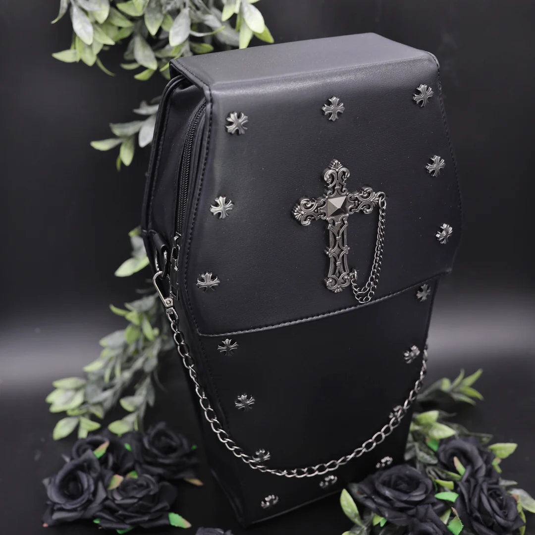 Coffin Metal Studded Cross and Chain Handbag Backpack (Black) (37cm)