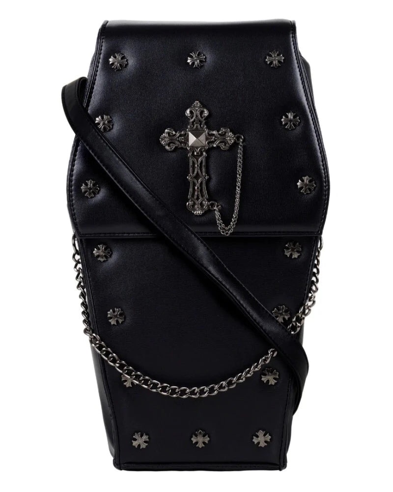 Be the baddest and the boldest with this Coffin Backpack. Crafted from vegan black leather with silver metal detailing and a killer cross chain emblem, it’s the ultimate accessory for making a statement. Wear it as a backpack or a shoulder bag, and customize the look with the adjustable straps and removable decorative chain. RIP boring […]