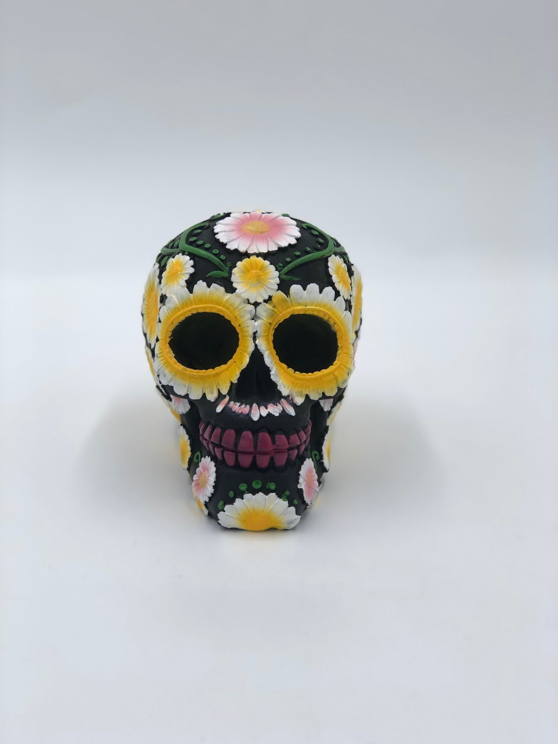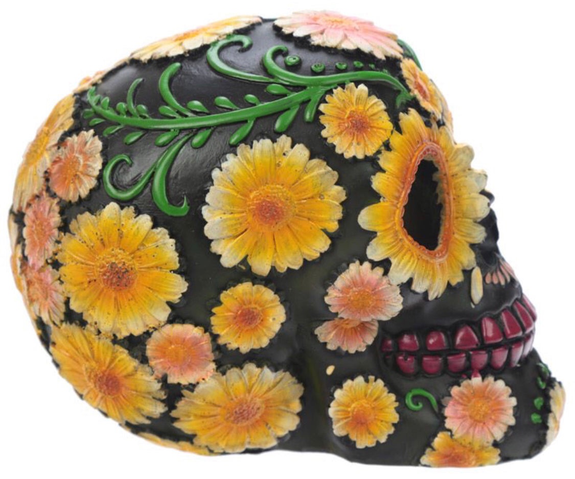 Day of the Dead Skull Head with Daisy Floral Motif Black/Yellow Daisy Sugar Skull SK268 (11.5cm)