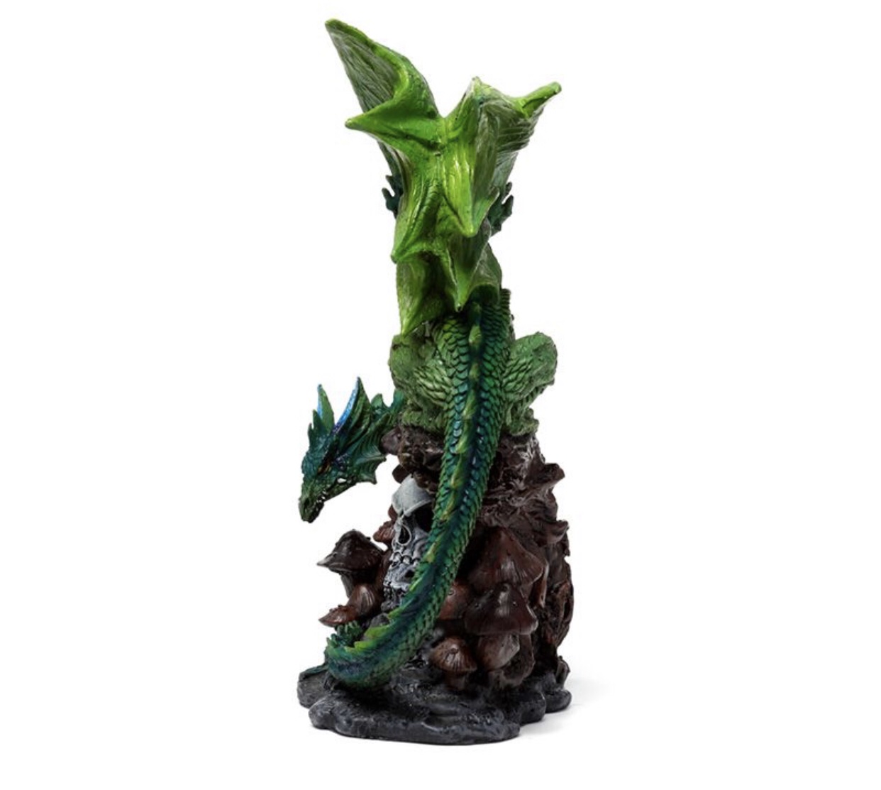 Product Description Enchanted Nightmare Emerald Spirit of the Forest Skull Dragon Material: Resin Product Attributes Dimensions:- Height 23cm Width 15cm Depth 9.5cm