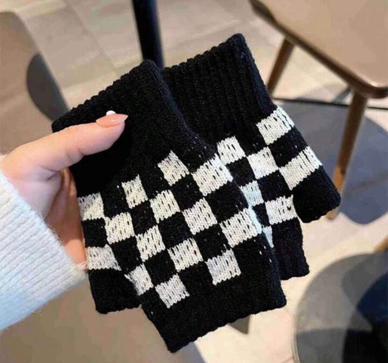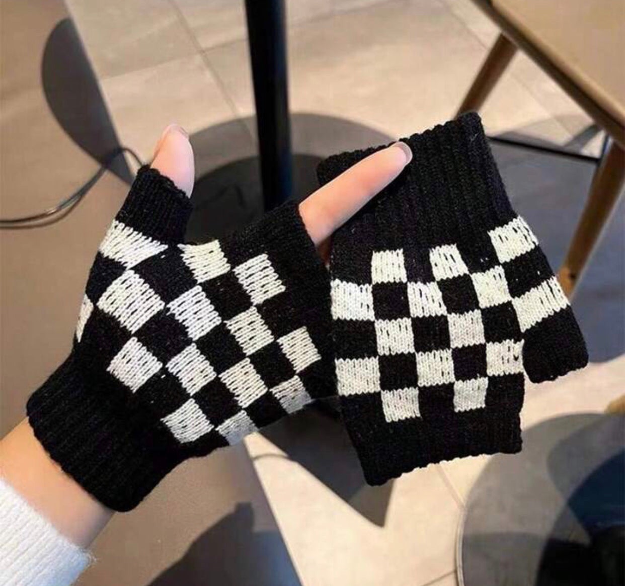 Black And White Checkered Pattern Acrylic Fingerless Gloves.