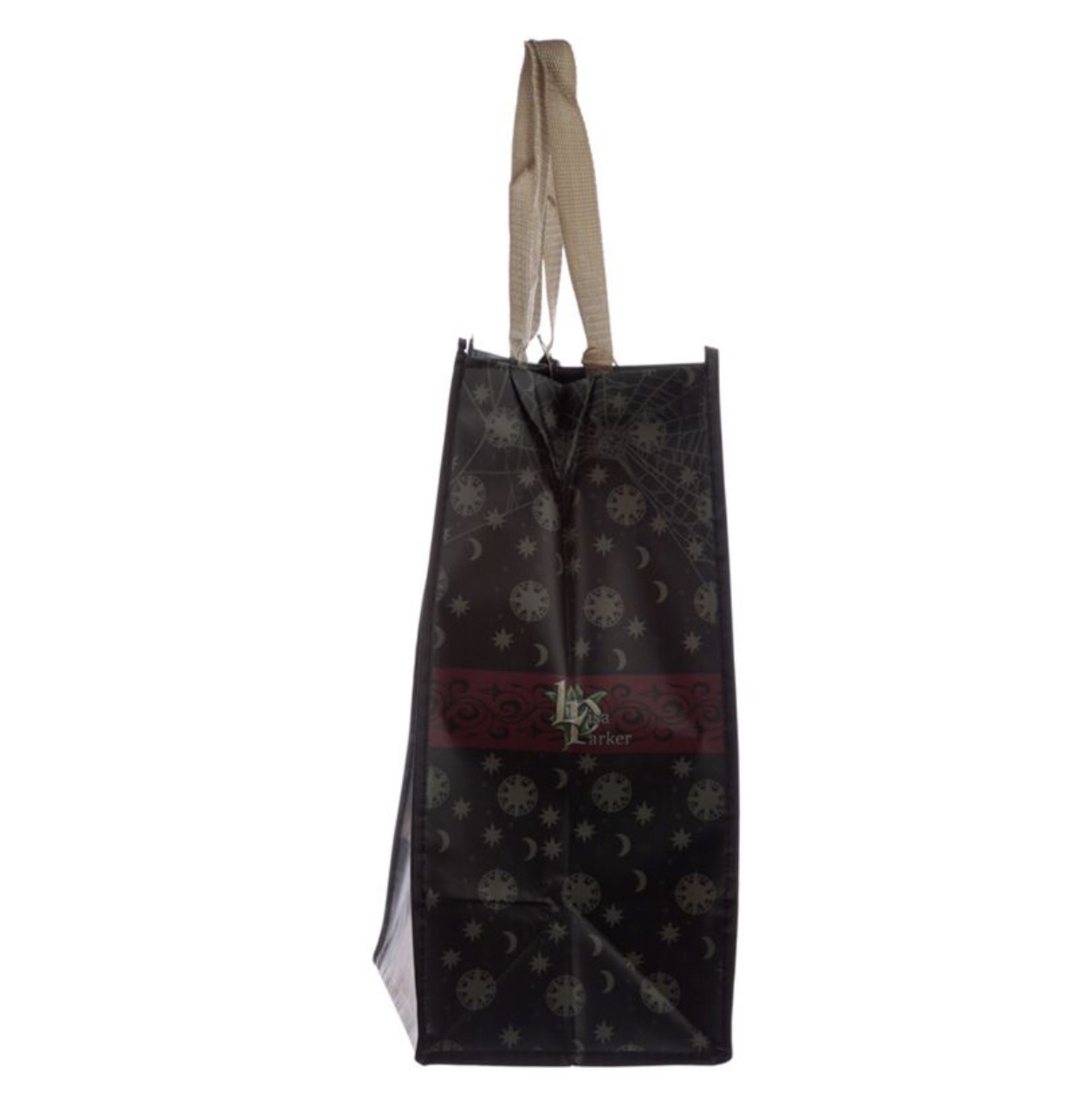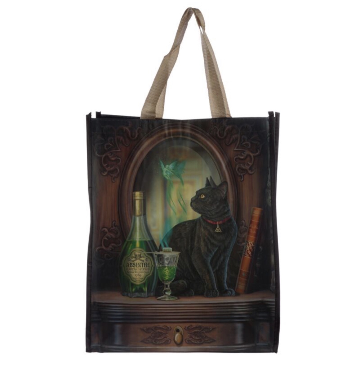 Product Description Lisa Parker Absinthe Cat Reusable Shopping Bag Material: Laminated Polypropylene and Polypropylene Webbing Handles Reusable: Yes