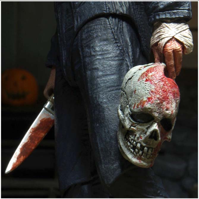 This screen-accurate Michael Myers action figure stands in 7″ scale and comes with knives, bat, bulb, skull mask, Halligan bar and interchangeable head and hands… and he’ll need it all when the Strode women set out to end his evil reign of terror.