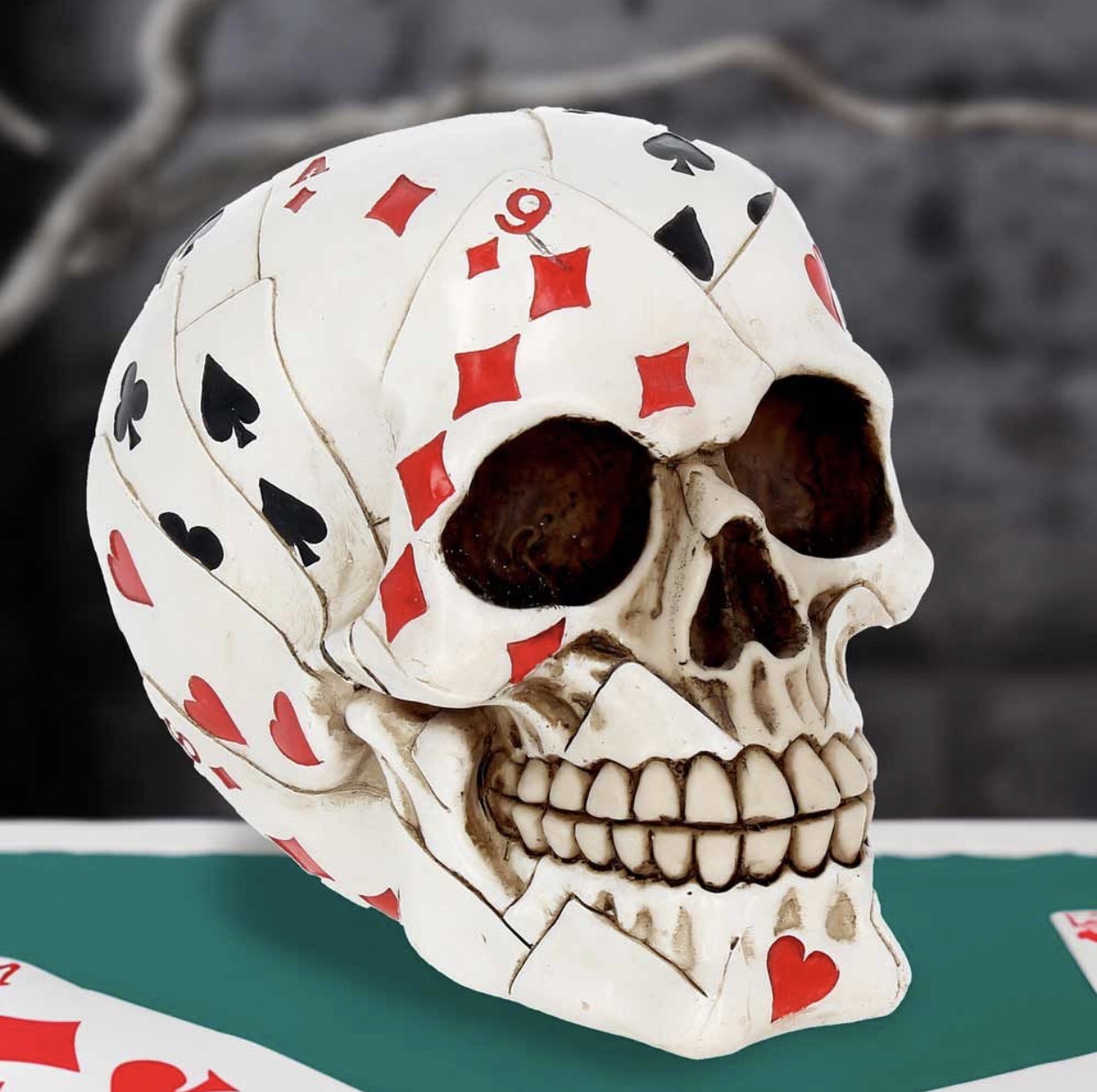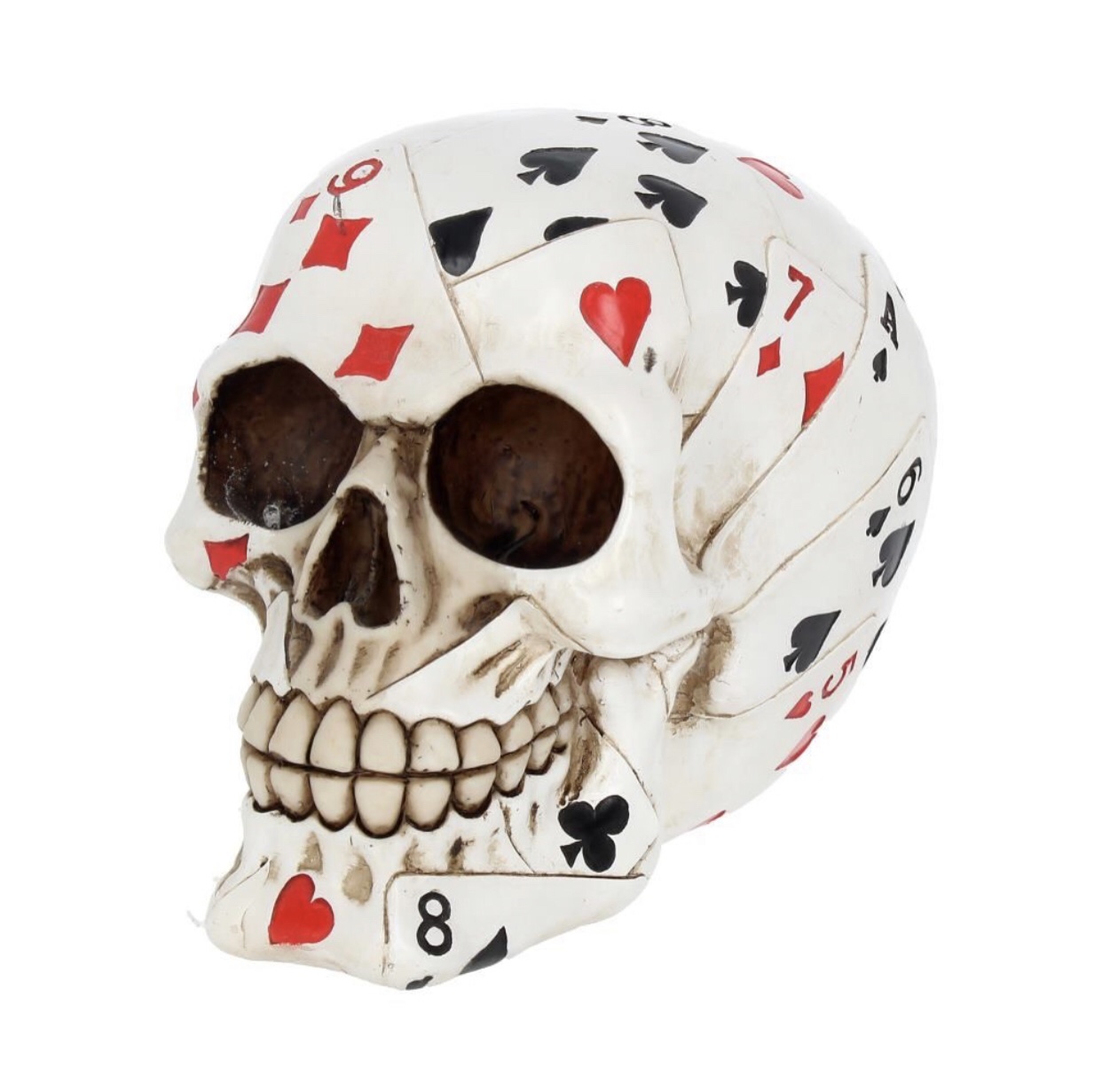 Material:Polyresin Beautifully crafted realistic human skull. Decorated with Playing Cards. Cast in the finest resin. Painstakingly hand-painted.