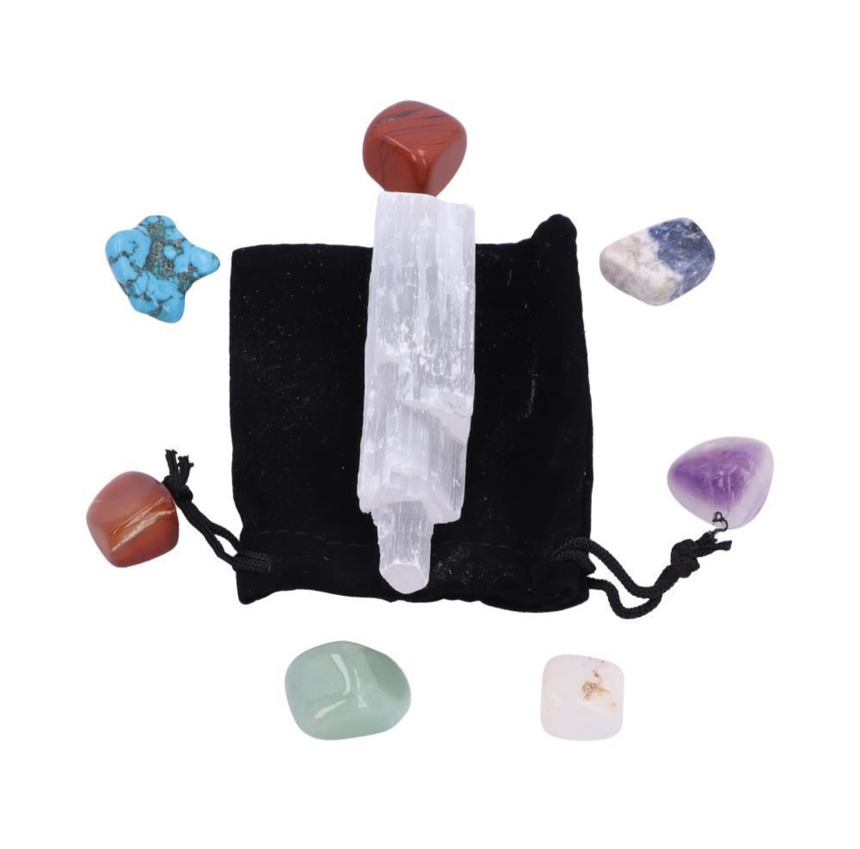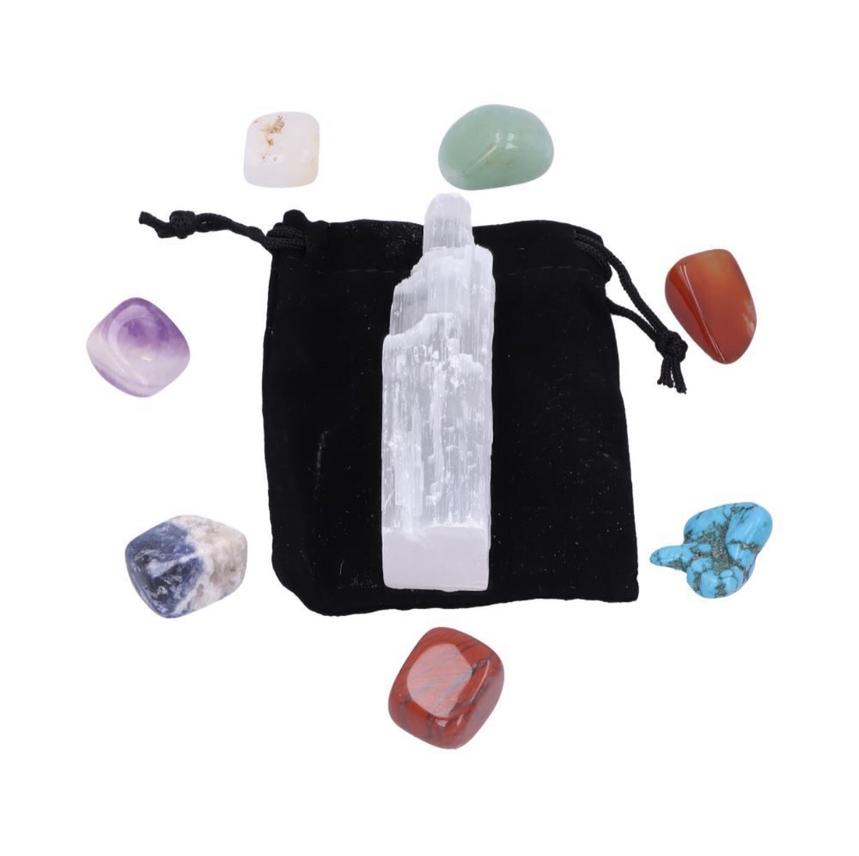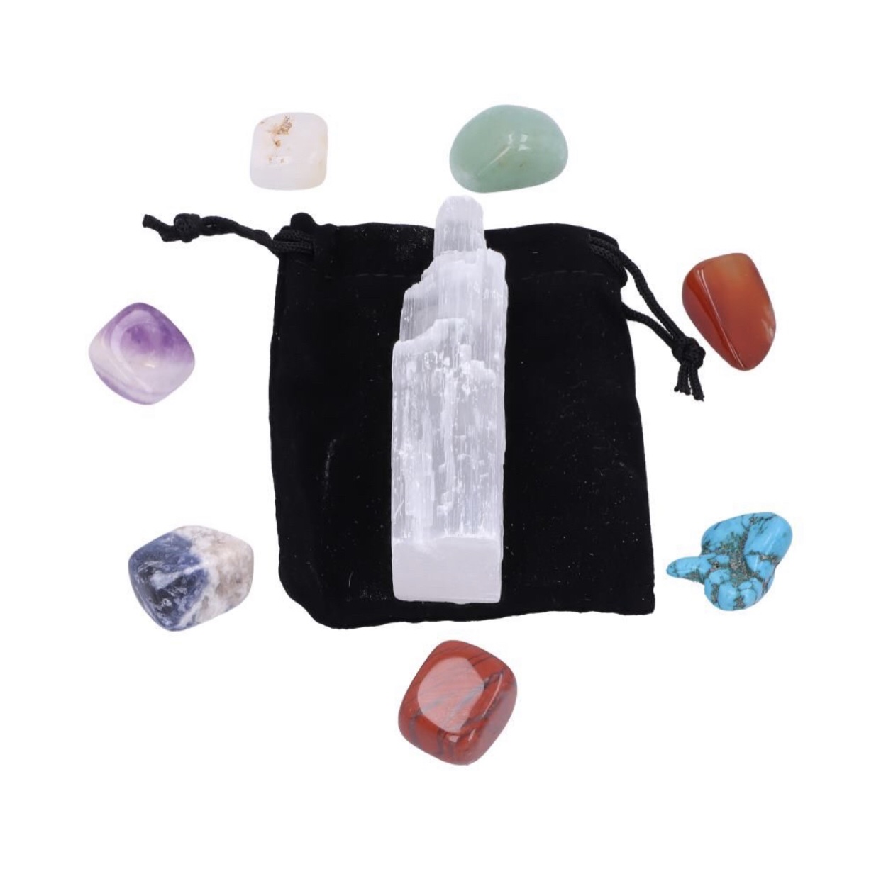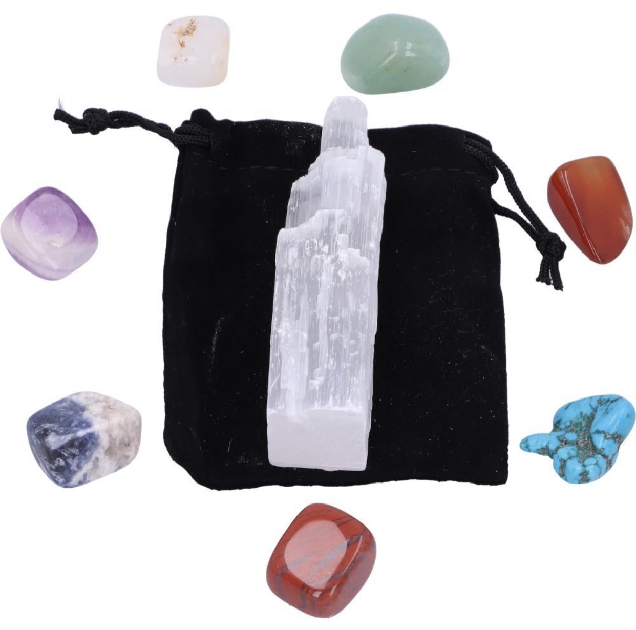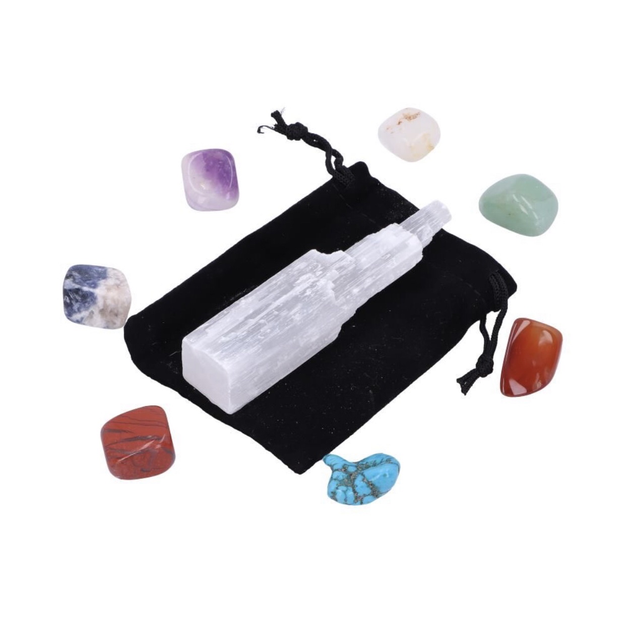 Description: Material:Gemstones 7 Coloured Chakra Stones. Comes with black pouch to keep safe. Includes a Selenite Crystal Wand. Contains a Energy Center Chart.