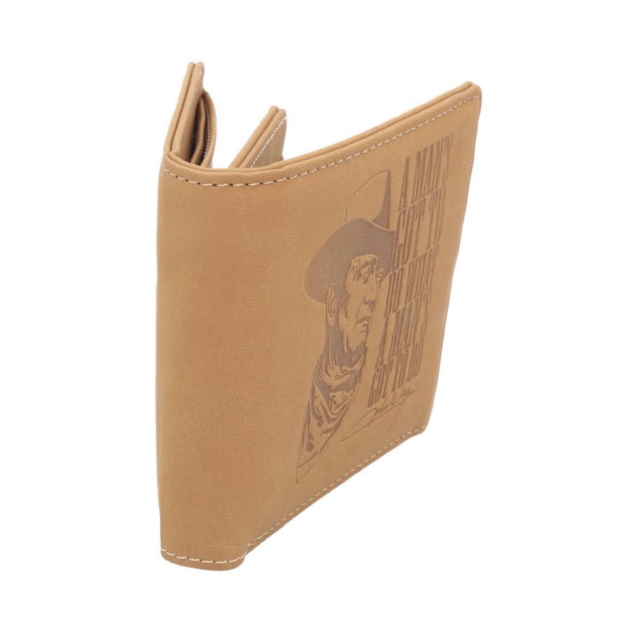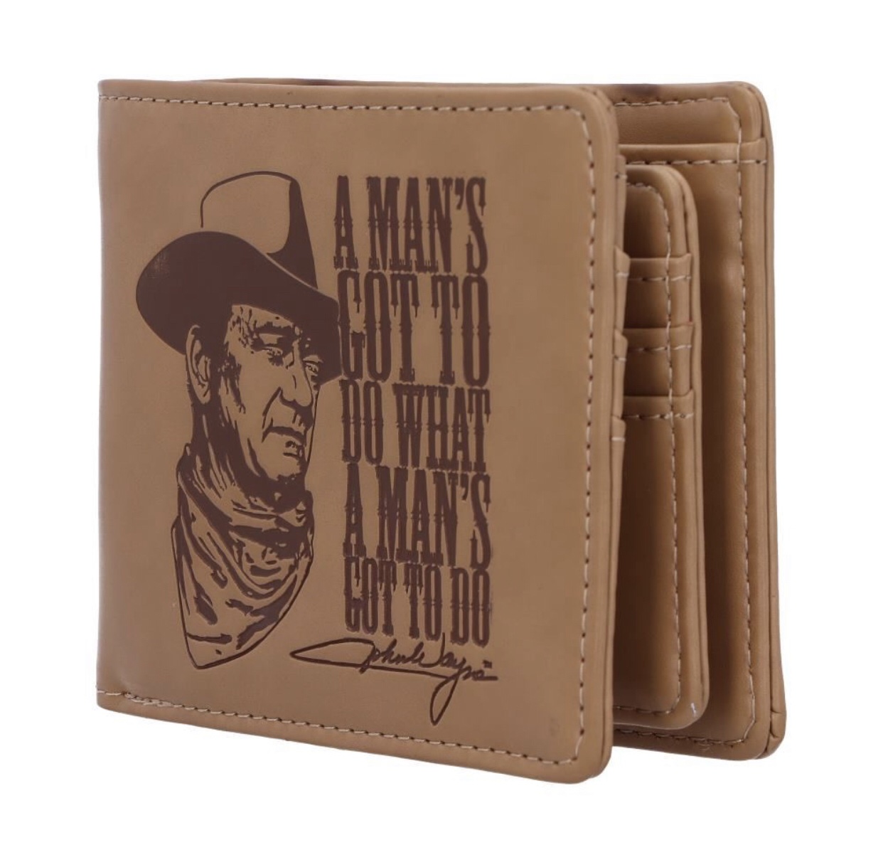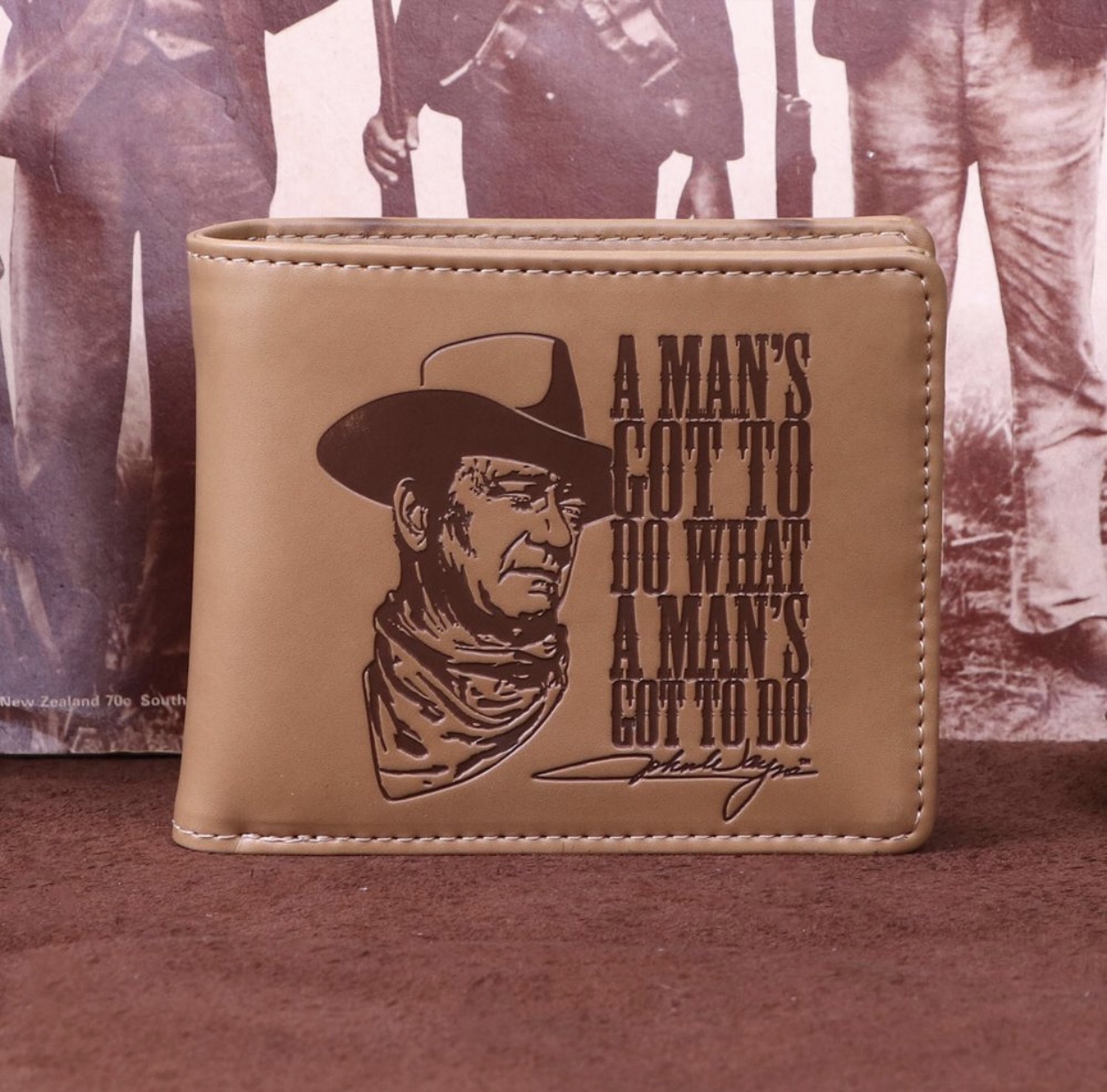 Tan wallet with the words ‘A Mans Got To Do What A Mans Got To Do’ emblazened across the front.