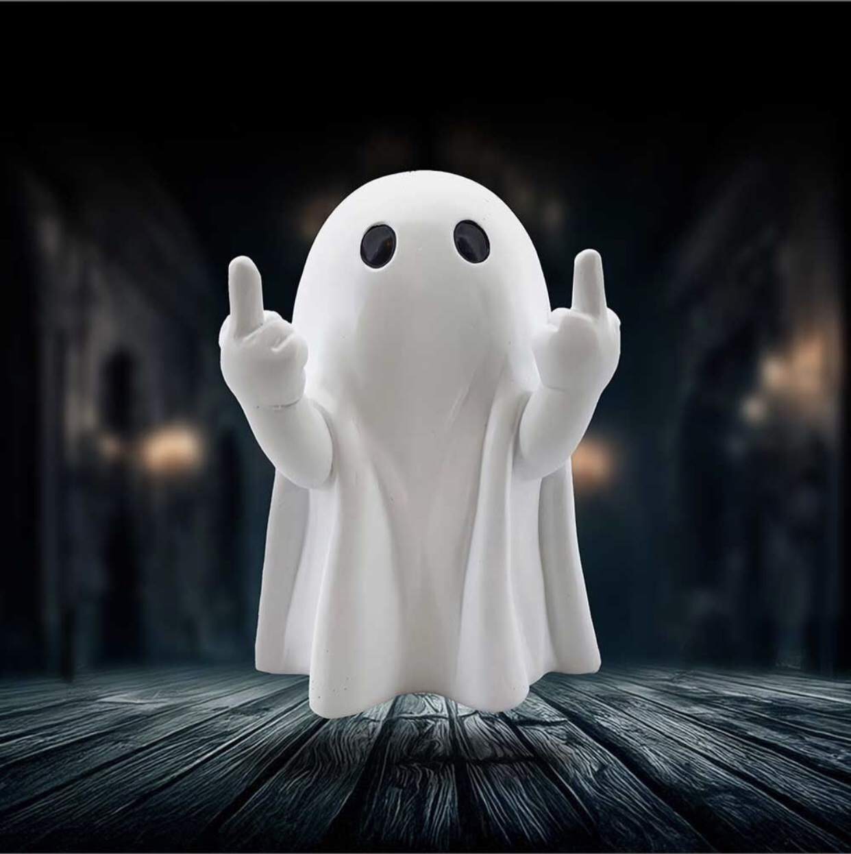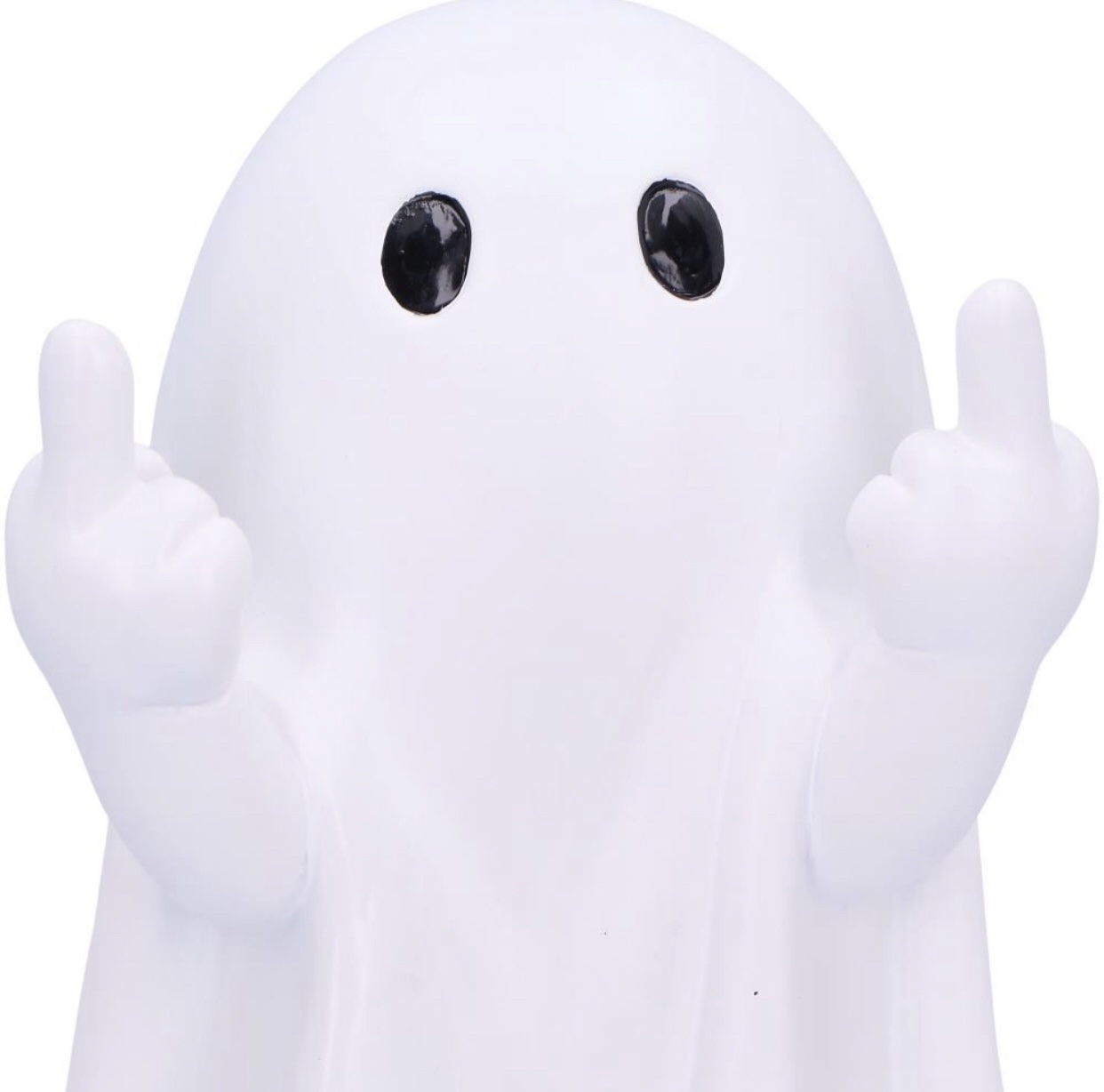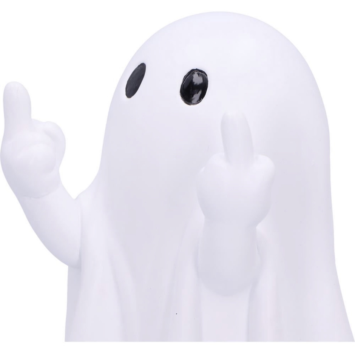 Material:Polyresin A cheeky, white ghost figurine with a rebellious attitude. Features a classic ghost shape with both middle fingers raised in defiance. Packaged in a decorative gift box, perfect for gifting or display. Ideal for collectors of quirky home decor, alternative lifestyle fans, and lovers of dark humour.