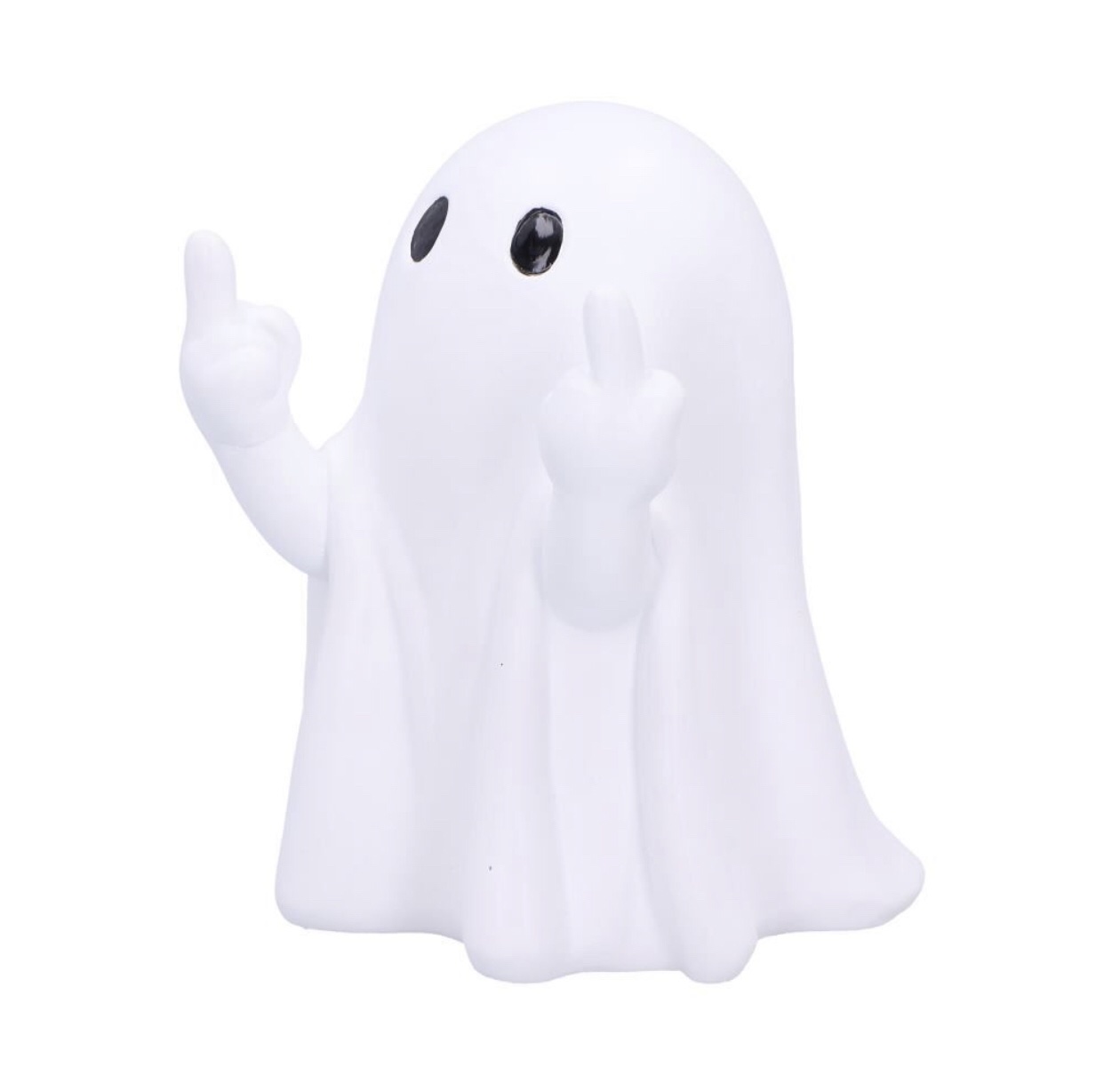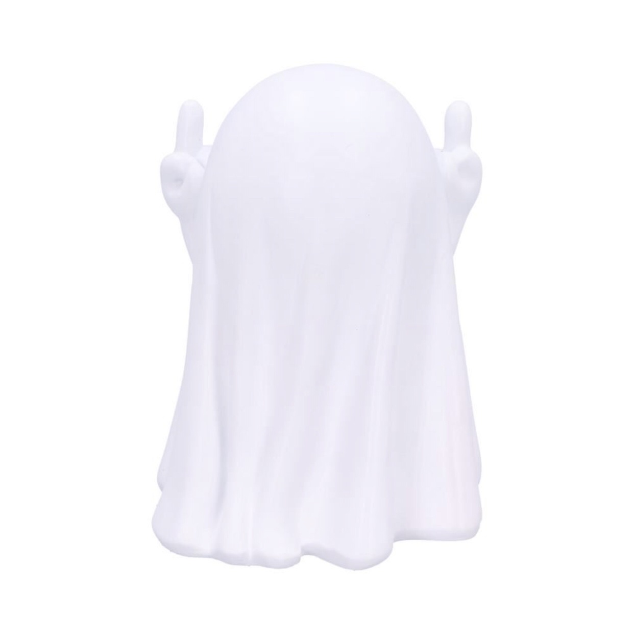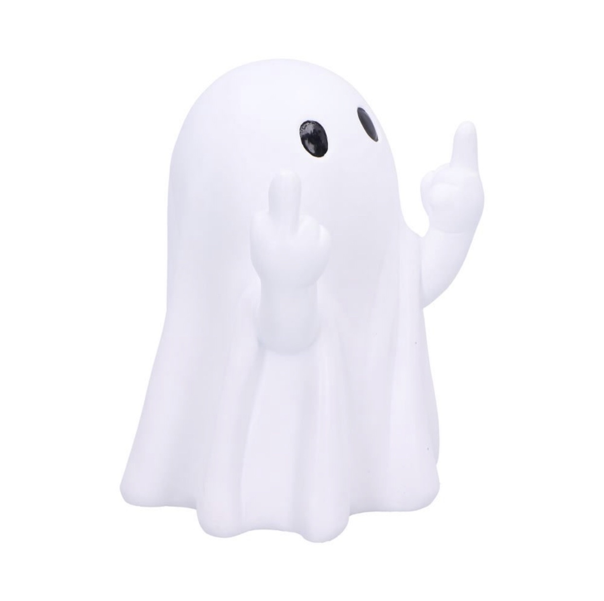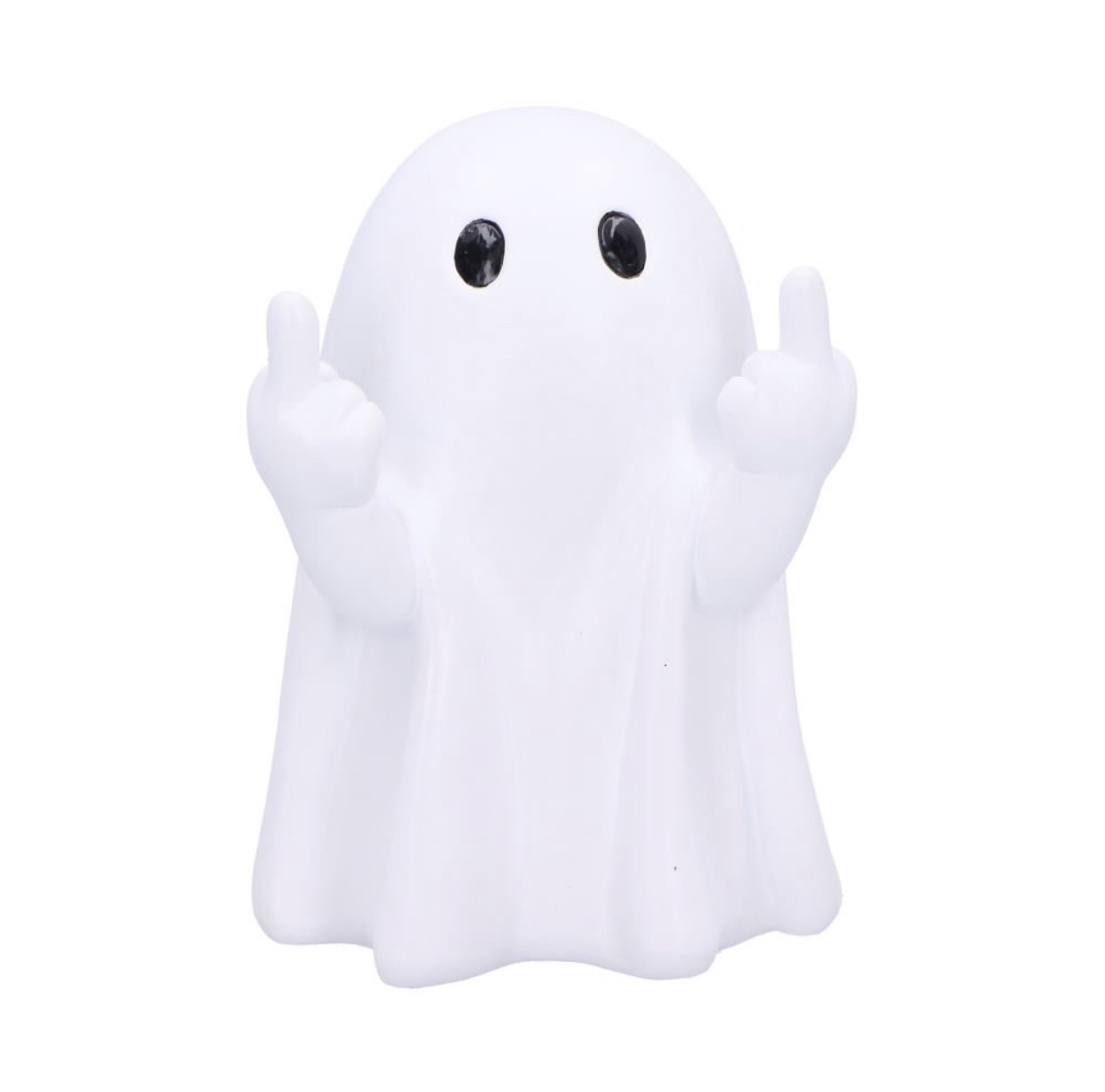 Material:Polyresin A cheeky, white ghost figurine with a rebellious attitude. Features a classic ghost shape with both middle fingers raised in defiance. Packaged in a decorative gift box, perfect for gifting or display. Ideal for collectors of quirky home decor, alternative lifestyle fans, and lovers of dark humour.