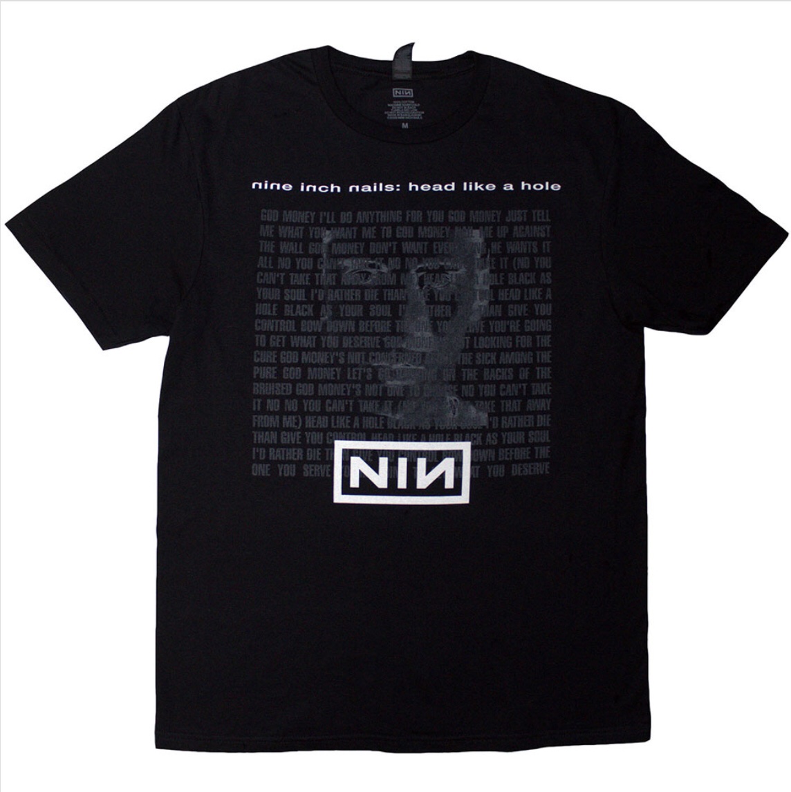 An official licensed Nine Inch Nails T-Shirt featuring the Head Like A Hole design motif.