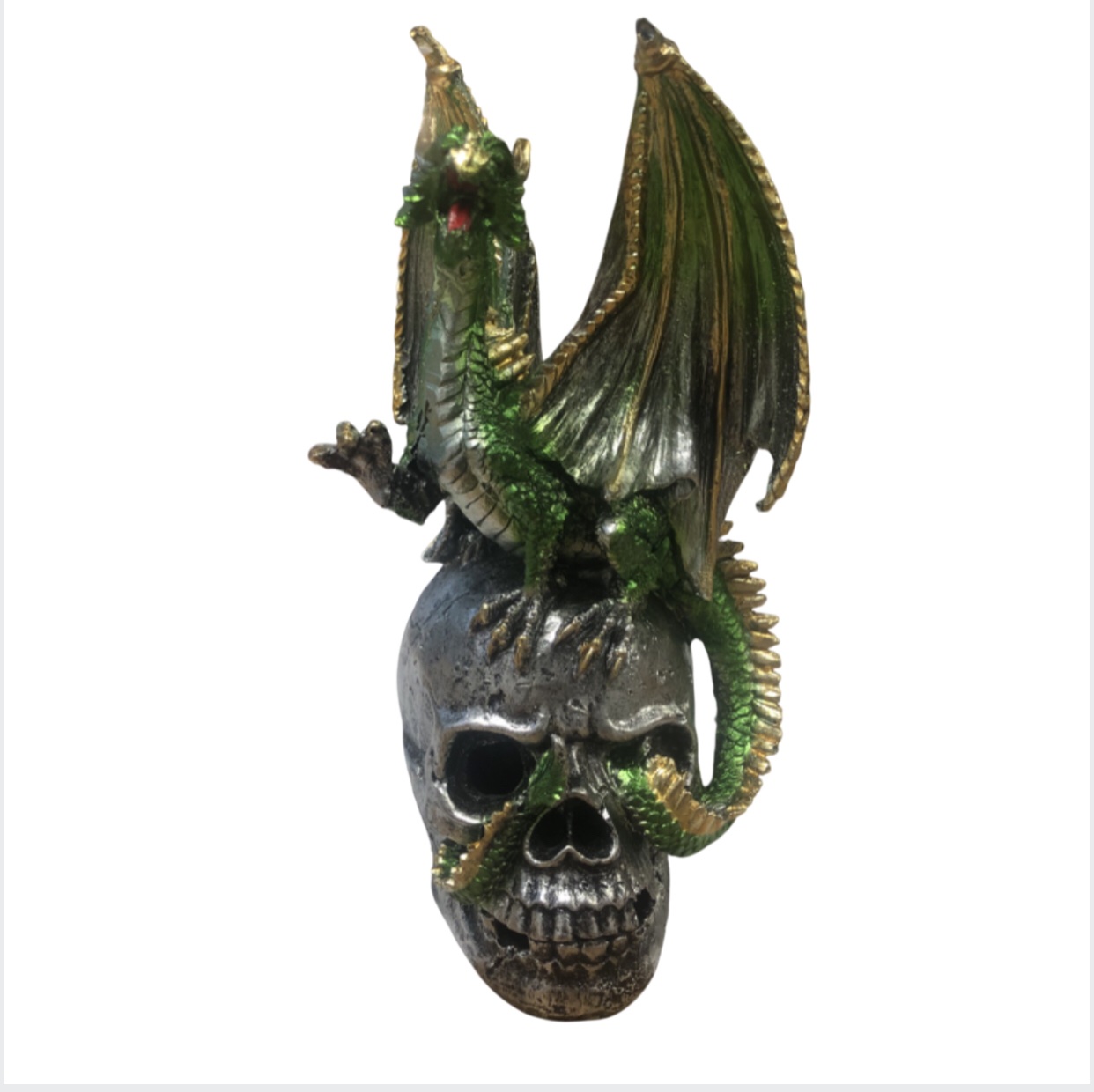 SACRED Silver Skull Green Dragon On Skull Light Up Ornament (17cm)