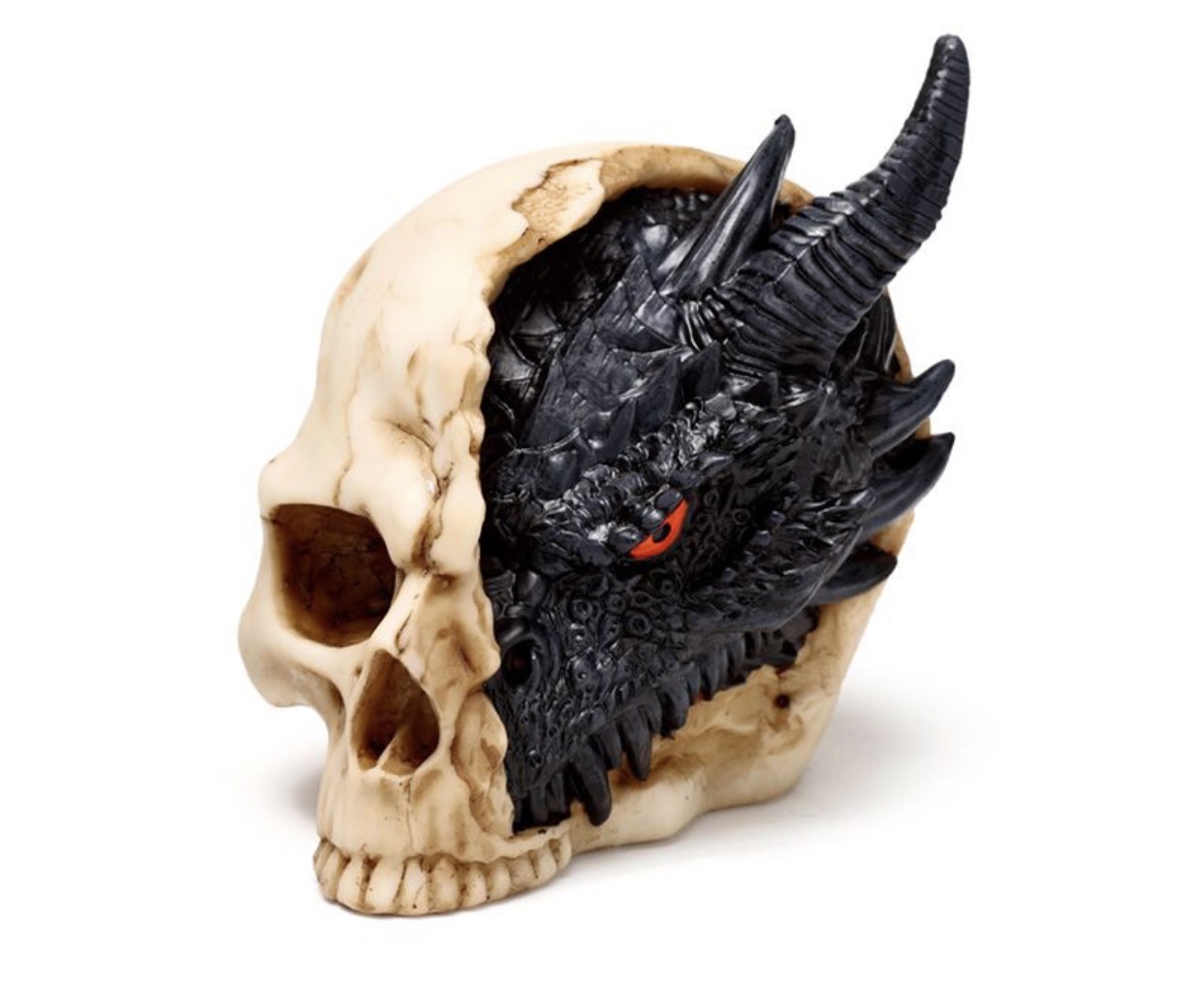 Product Description Shadows of Darkness Black Dragon in Skull Small Material: Resin Product Attributes Dimensions:- Height 10cm Width 8cm Length 11.5cm