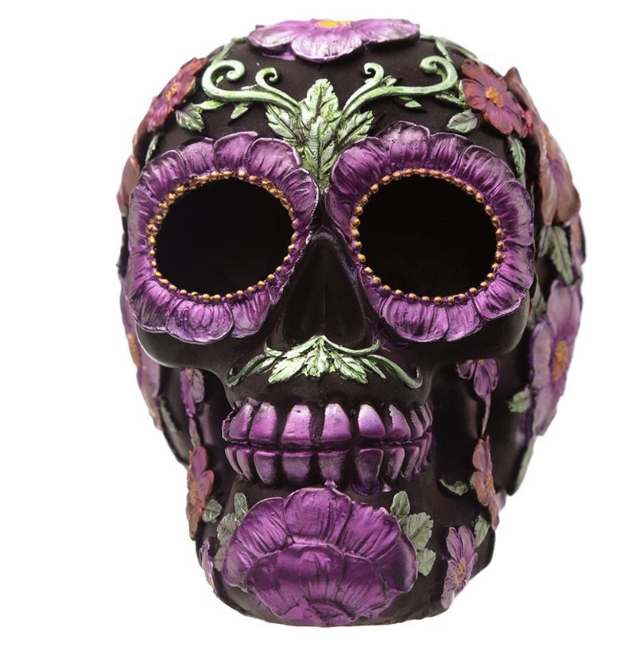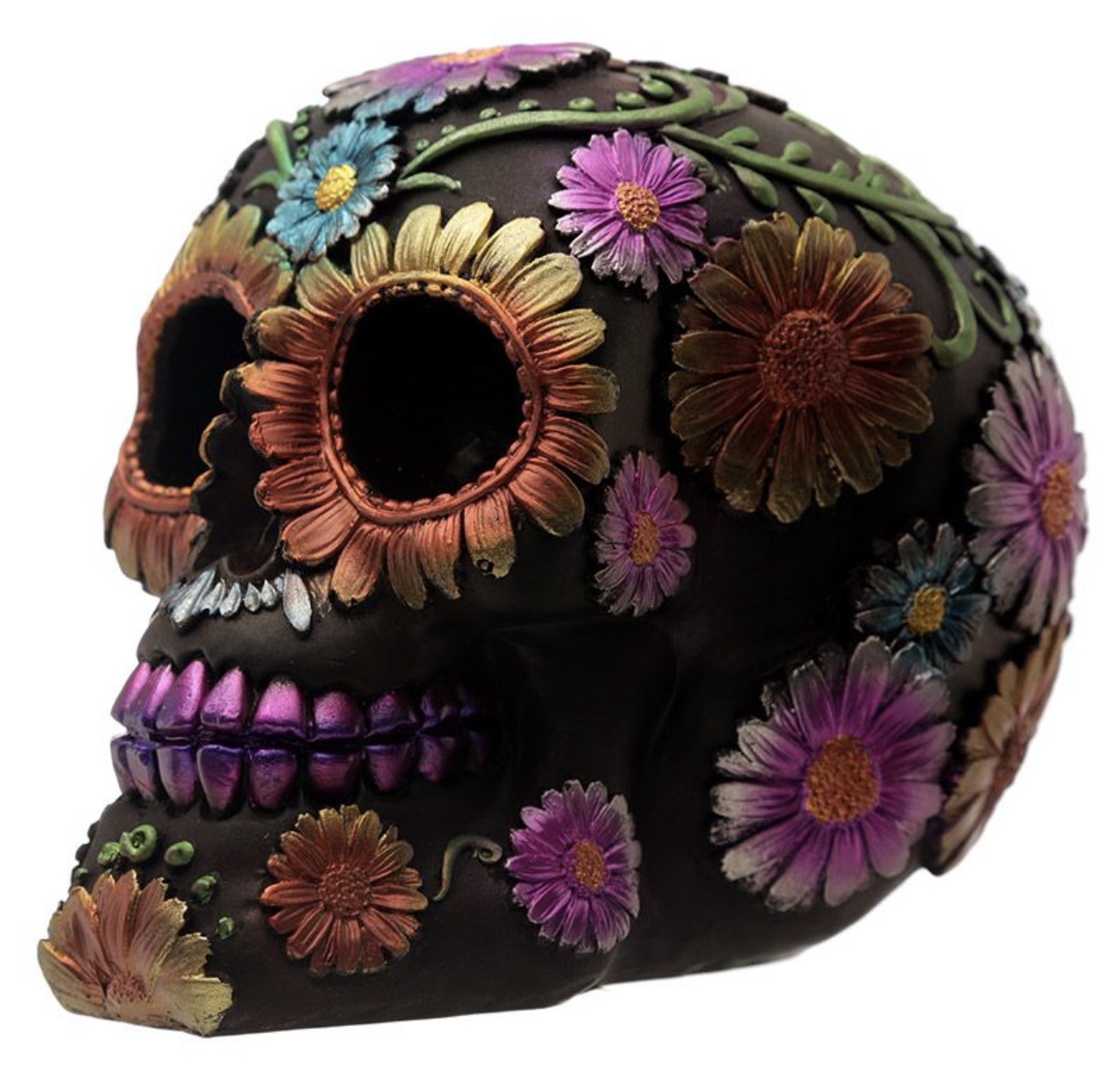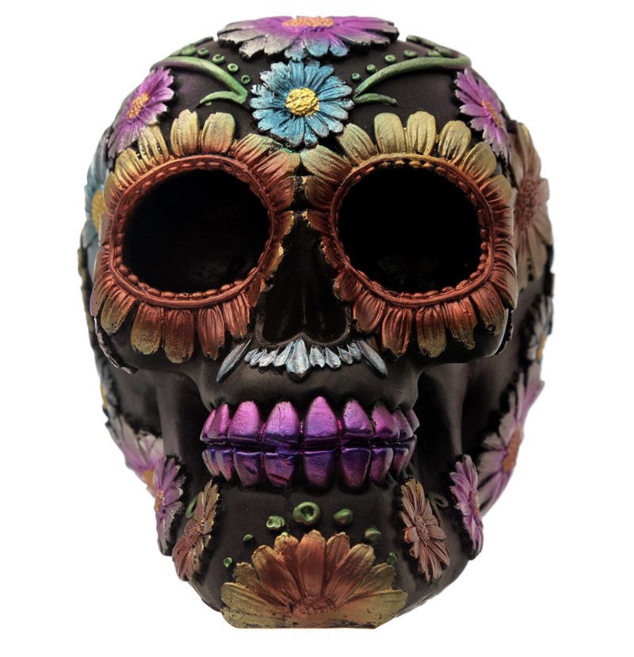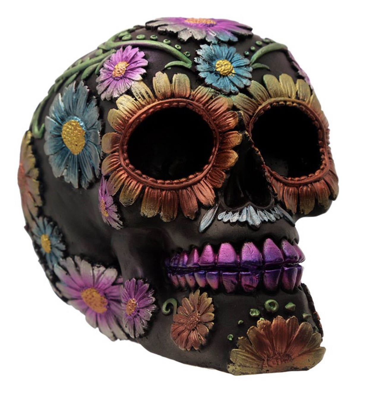 Product Description Metallic Day of the Dead Daisy & Flower Skull Decoration Material: Resin