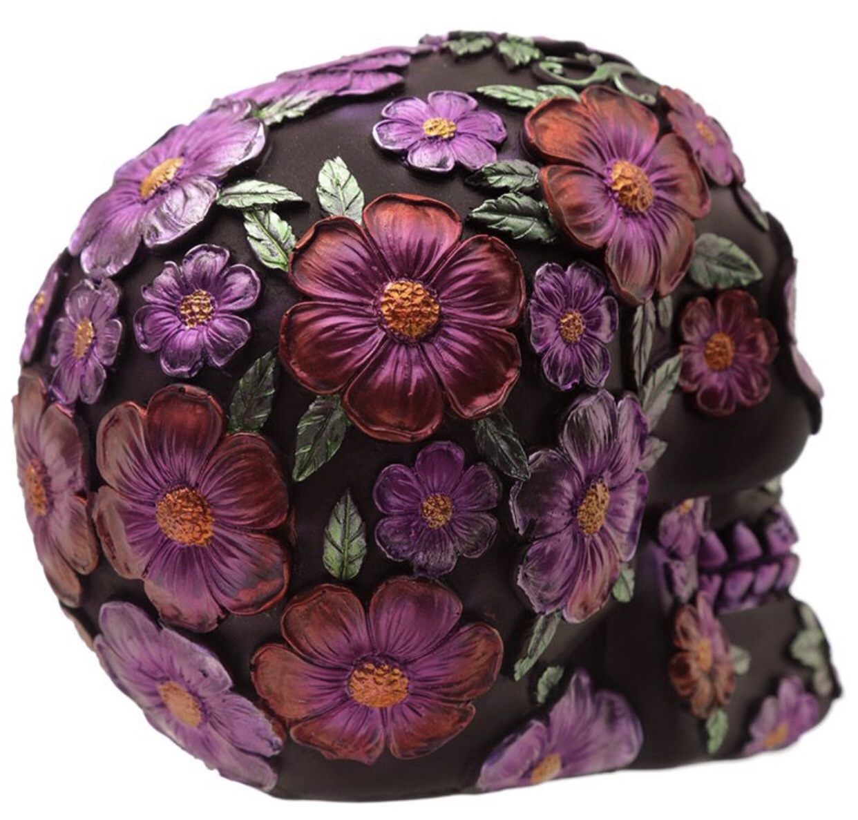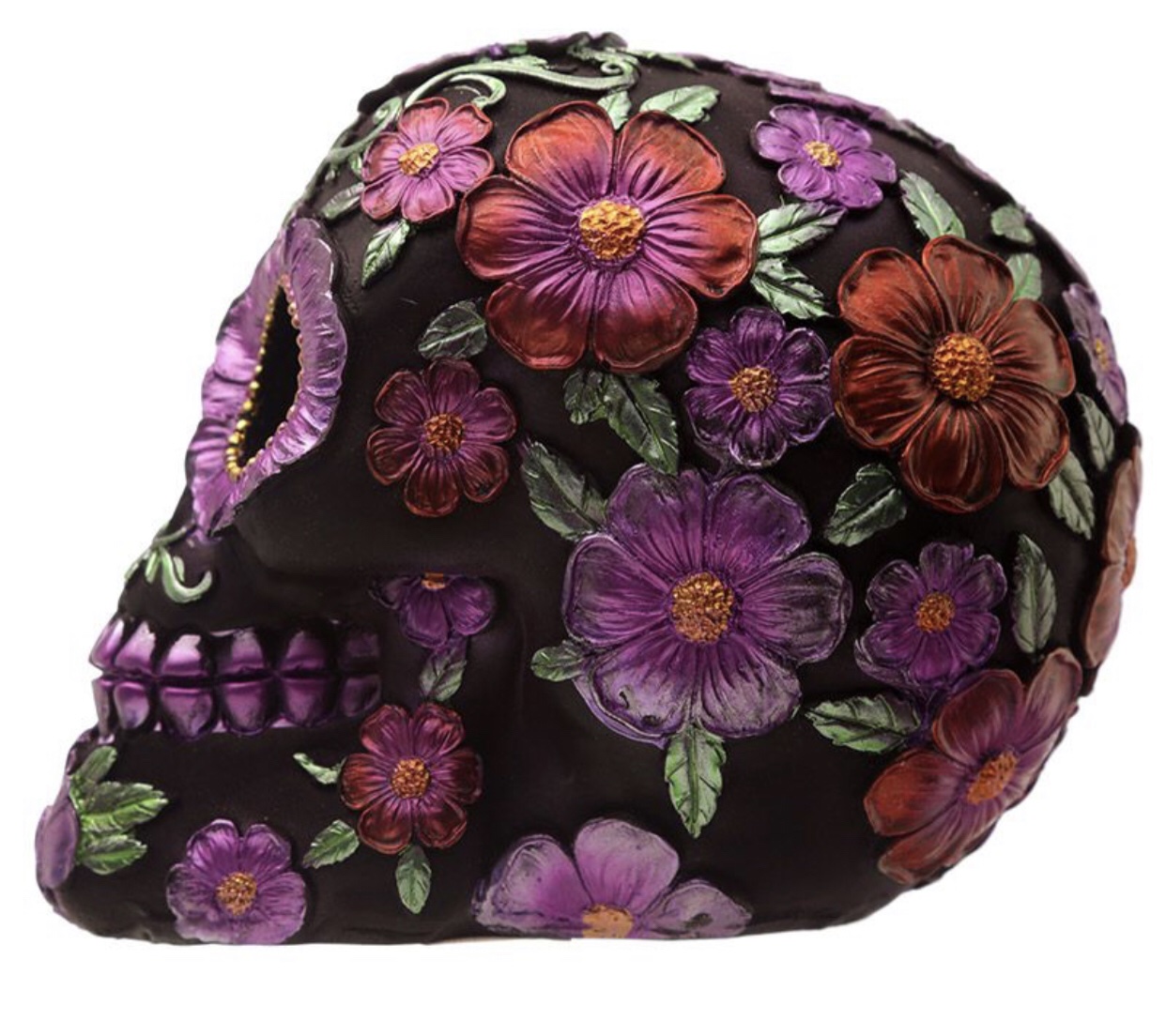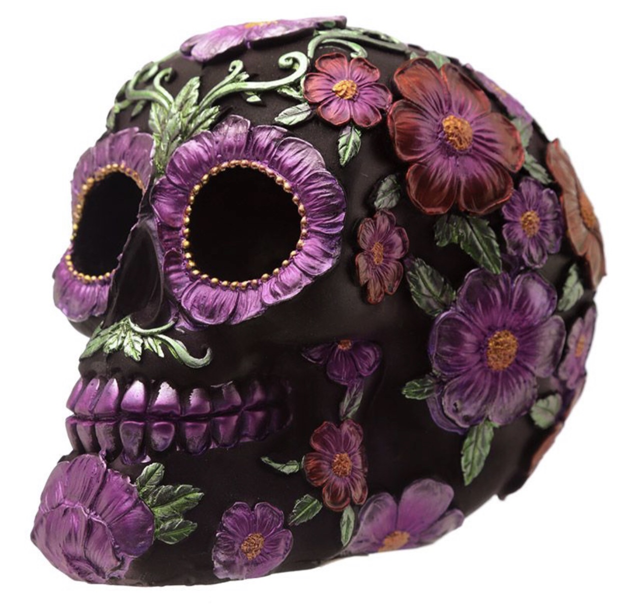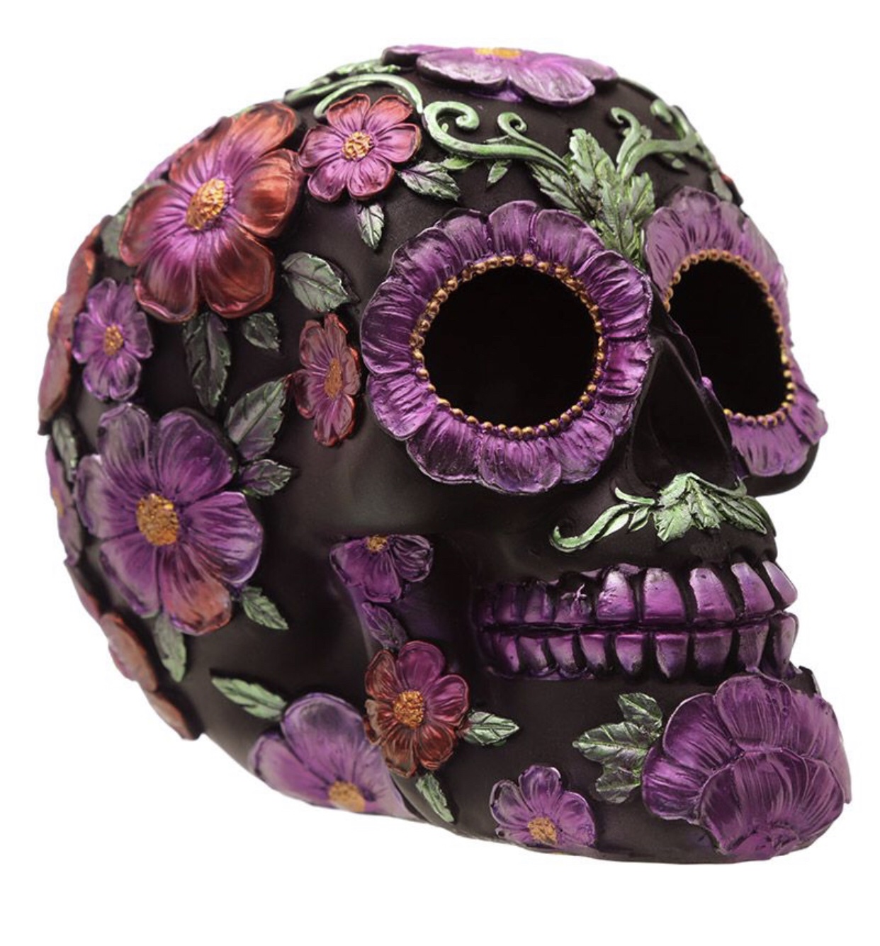 Product Description Metallic Day of the Dead Daisy & Flower Skull Decoration Material: Resin