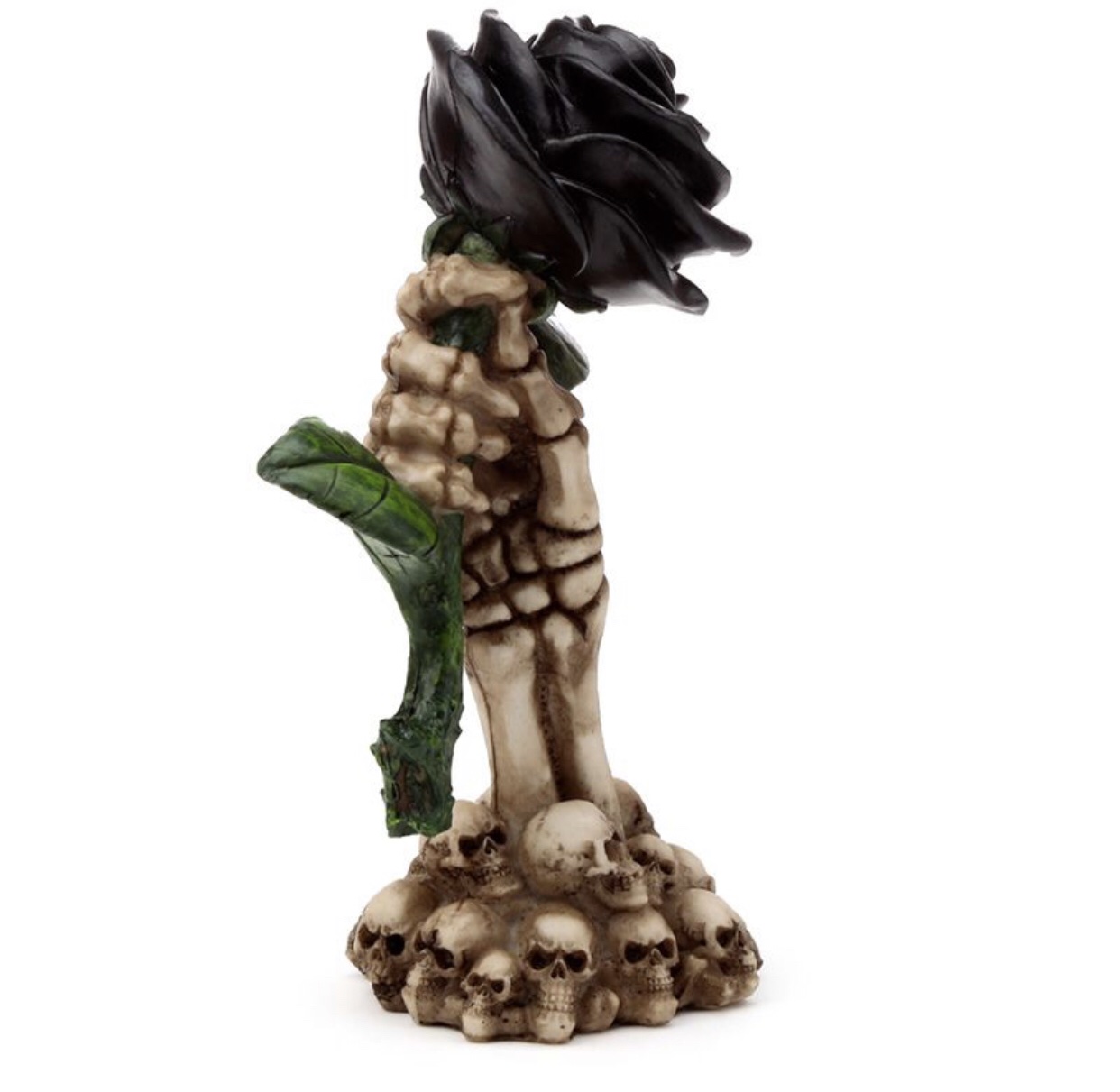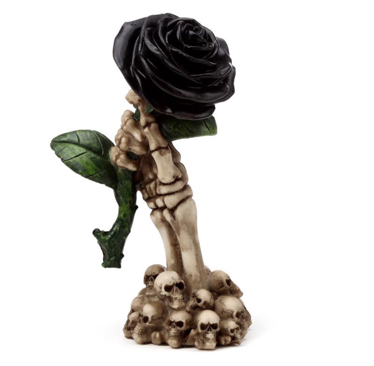 Product Description Skeleton Hand Holding Black Rose Decoration Material: Resin Product Attributes Dimensions :- Height 17cm Width 8cm Depth 6cm