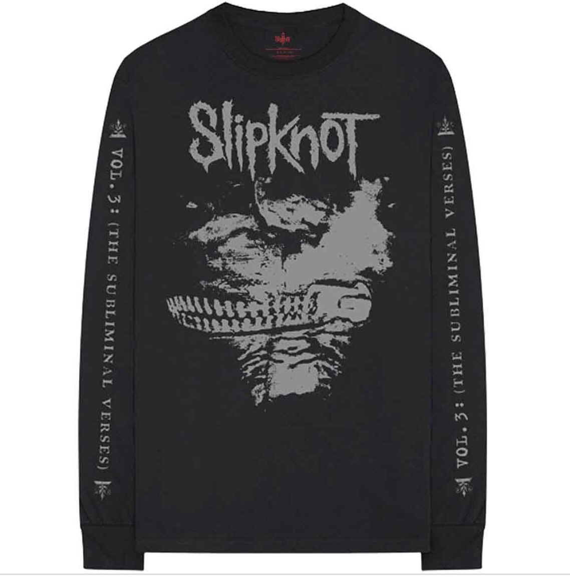 An official licensed Slipknot Unisex Long Sleeved Tee featuring the ‘Subliminal Verses’ design motif. This high quality t-shirt design is available in the black colourway.