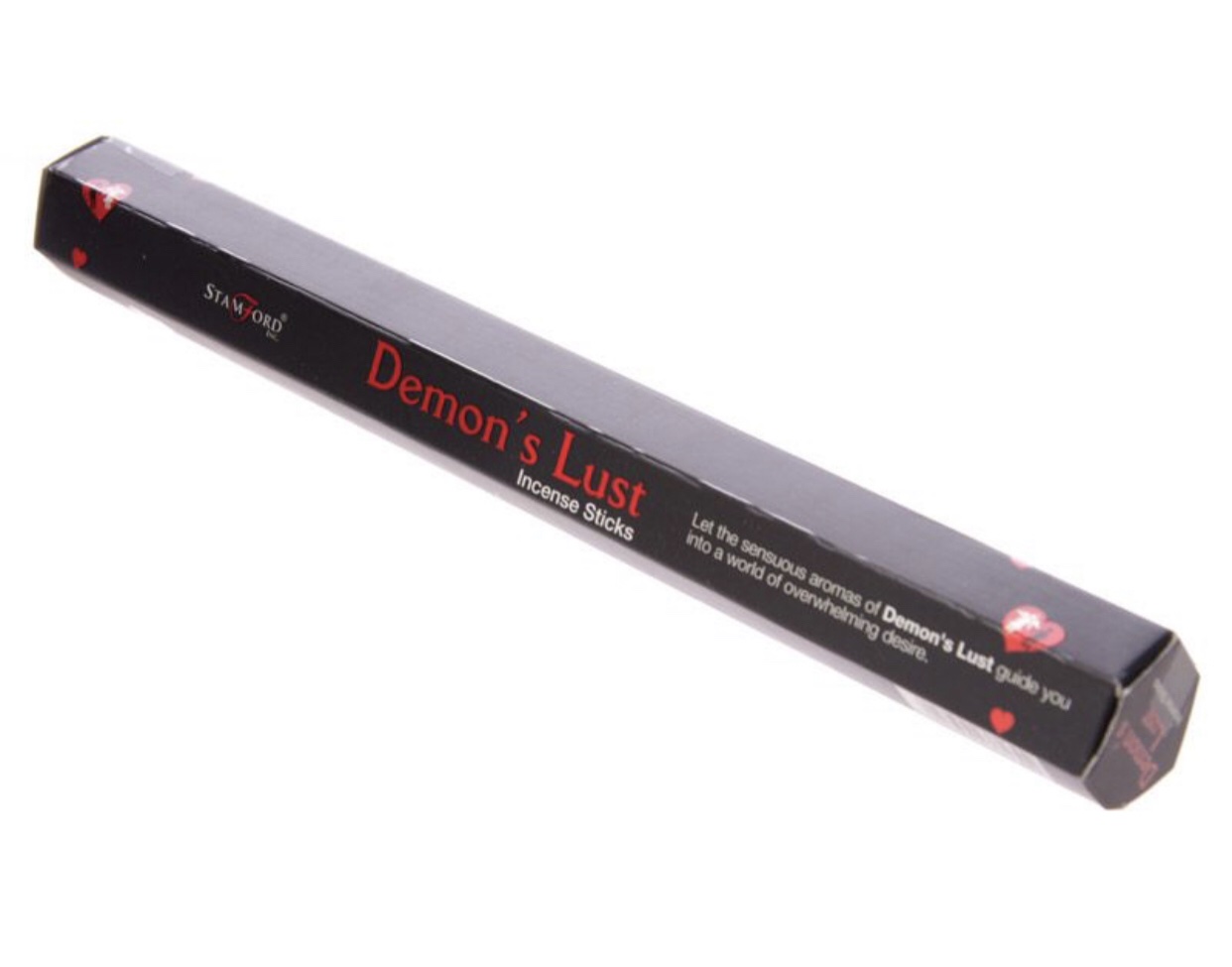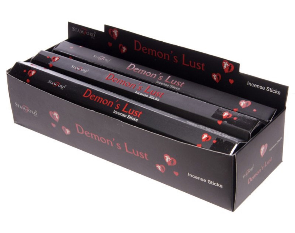 Product Description 37130 Stamford Black Incense Sticks Demons Lust Brand: Stamford Black Material: Hand rolled top quality incense, resins and plant material. Fragrance: Green Oriental Approximate Sticks per Pack: 12 sticks Approximate Burn Time: 30 Minutes Cruelty Free: Yes Vegan: Yes Seasonal Holiday / Festive Occasion: Halloween